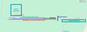 2. The second parking area is located along the left side of the road IN THE GRAVEL on the shoulder, BEFORE the roundabout only. Please either pull in or back in to park perpendicular to the road, to maximize space. There is one “emergency access” driveway that must not be blocked. This parking can be used for racers as well as spectators and other attendees, and cars parked here can come and go as they like.